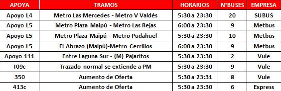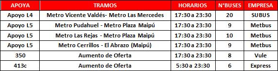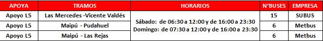 En el caso de los tramos donde se registra una mayor cantidad de pasajeros, se sumarán servicios especiales con 73 buses de apoyo al Metro de lunes a viernes y 23 vehículos durante el fin de semana.