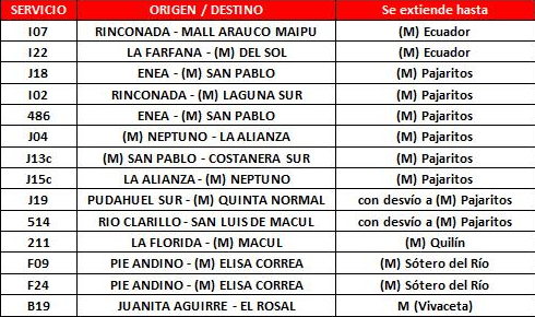 Lee también: Súper Lunes: Registran barricadas y manifestaciones en distintos puntos de la Región MetropolitanaA esto se suma un monitoreo especial a los servicios de alta demanda y refuerzos de servicios para las horas punta. Asimismo, continuarán funcionando los buses de apoyo a las Líneas 4 y 5 de Metro, que resultaron con daños tras el 18 de octubre, especialmente en las comunas de Maipú, La Florida, La Cisterna y Puente Alto.