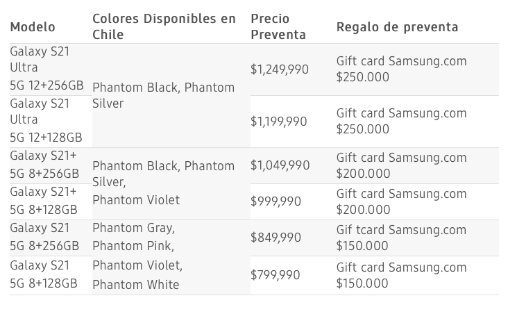 Todas las compras en preventa de Galaxy S21 incluirán una gift card de $150.000, las de Galaxy S21+ una de $200.000, y las de Galaxy S21 Ultra una de $250.000.