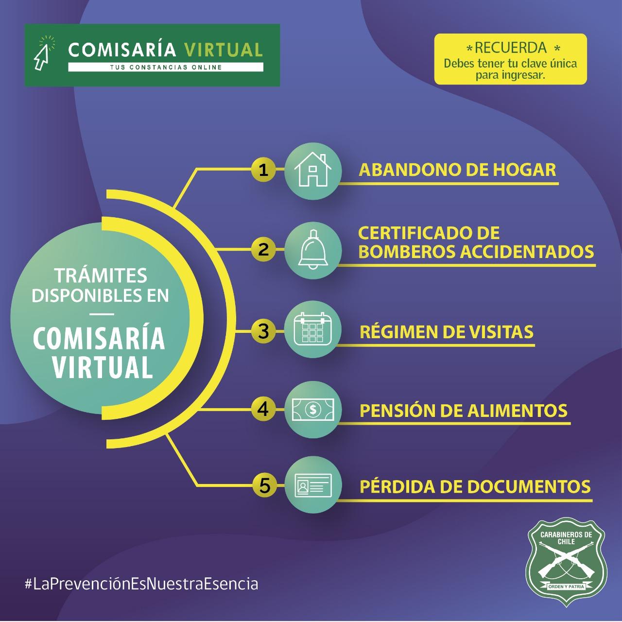 Lee también: Carabineros afirma que no ha identificado a autores de agresiones contra Gustavo Gatica y Fabiola CampillaiCabe destacar que la plataforma cuenta con altos estándares de seguridad y se puede acceder a través de la clave única que proporciona el Registro Civil. Esto permite ingresar constancias con fines laborales, por abandono de hogar, pensión de alimentos, régimen de visitas, pérdida de documentos, teléfono móvil e, incluso, el certificado de bombero accidentado.