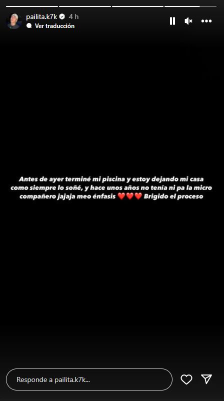 En el posteo siguiente, el intérprete de Ultra Solo escribió: "Antes de ayer terminé mi piscina y estoy dejando mi casa como siempre lo soñé". "Hace unos años no tenía ni pa' la micro compañero. Jajaja, meo énfasis. Brígido el proceso", agregó el artista, quién ha tenido una carrera en ascenso luego de su popularización tras publicar Dímelo Ma, junto a Marcianeke.