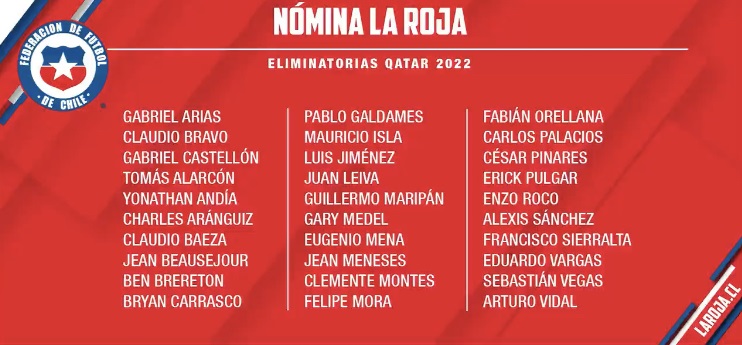 📋 La pelea por un cupo a la @FIFAWorldCup sigue y esta es la nómina que eligió Martín Lasarte para los partidos frente Argentina y Bolivia.#VamosChile #VamosLaRoja pic.twitter.com/jUNKd6Mq9B— Selección Chilena (@LaRoja) May 24, 2021