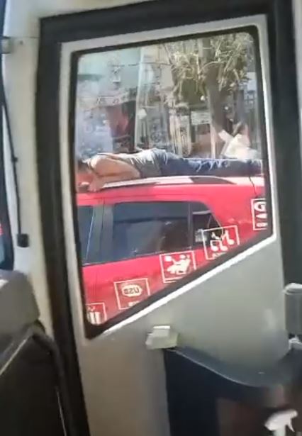"Solo pasaba por ahí y el vehículo rojo se detuvo en la intersección de Alameda con (Gral.) Velásquez con la persona ya en el techo. Cuando dio la luz verde, el vehículo rojo avanzó con dirección hacia la costa varias cuadras con la persona en el techo", relató el cazanoticias.