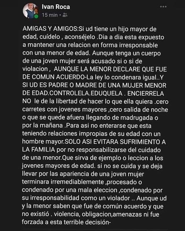 Dos días después de conocida la decisión, el edil escribió: “Si usted tiene un hijo mayor, edúquelo, aconséjelo. Día a día está expuesto a mantener una relación en forma irresponsable con una menor de edad. Aunque tenga el cuerpo de una joven mujer será sí o sí acusado de violación. Aunque la menor declare que fue de común acuerdo, la ley condenará igual”.