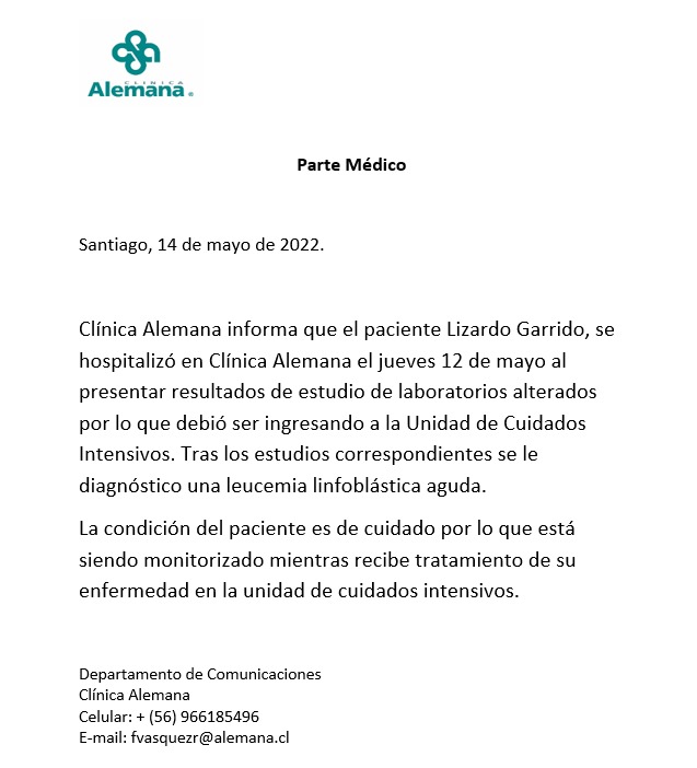 "Clínica Alemana informa que el paciente Lizardo Garrido se hospitalizó en la Clínica el jueves 12 de mayo al presentar resultados de estudios de laboratorio alterados por lo que debió ser ingresado a la Unidad de Cuidados Intensivos. Tras los estudios correspondientes se le diagnosticó una Leucemia Linfoblástica Aguda", sostiene el comunicado difundido por el centro de salud.