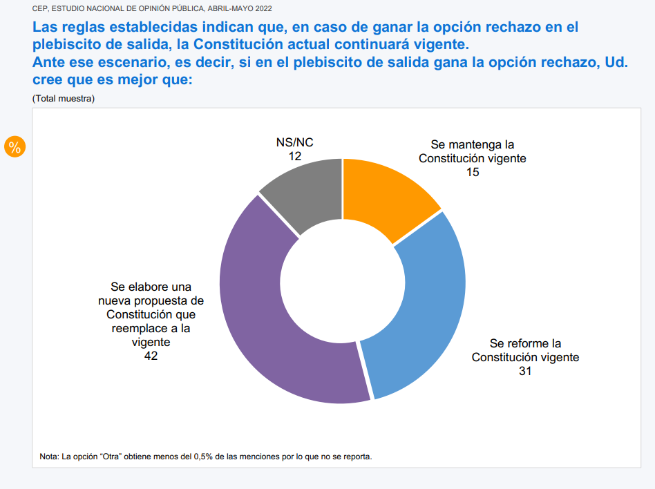 En esta misma línea, una pregunta abordó qué se debería hacer en caso de que la opción Rechazo gane en el plebiscito y se mantenga la Constitución de 1980. En tal caso, los y las encuestadas apoyaron en un 42% que "Se elabore una nueva propuesta de Constitución que reemplace a la vigente".