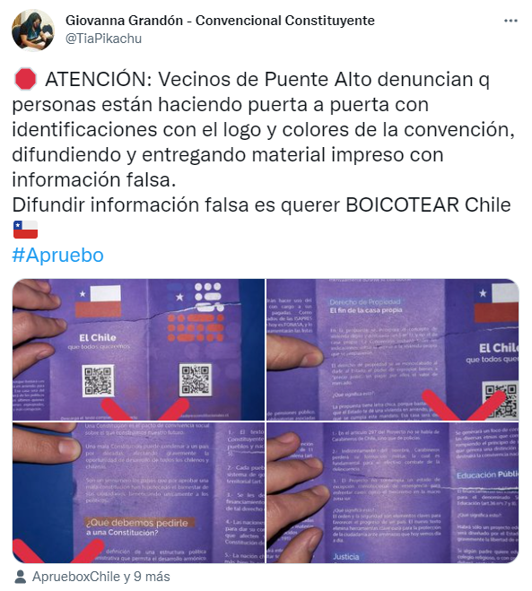 “Vecinos de Puente Alto denuncian q personas están haciendo puerta a puerta con identificaciones con el logo y colores de la convención, difundiendo y entregando material impreso con información falsa”, publicó Grandón, junto a imágenes de un folleto que replicaba la imagen de la Convención Constitucional.