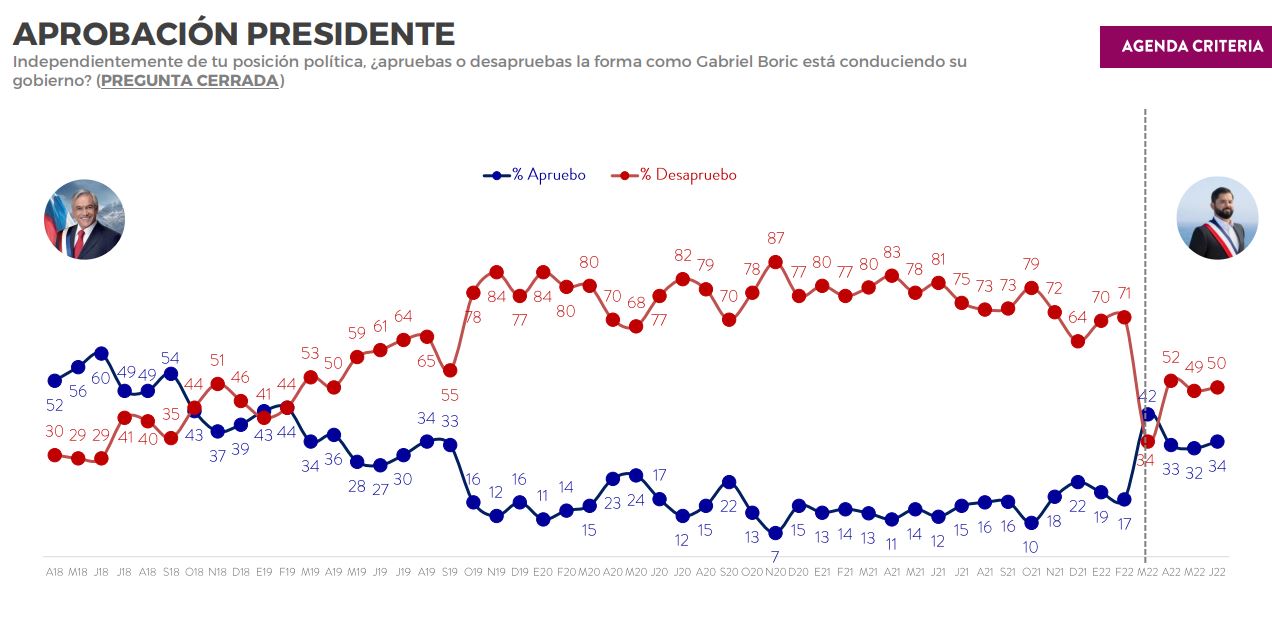 Por otro lado, Criteria señaló que la aprobación del presidente Gabriel Boric aumentó a 34%, es decir, dos puntos más que el mes anterior.