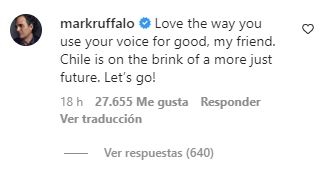 "Me encanta la forma en que usas tu voz para bien, amigo mío. Chile está al borde de un futuro más justo. ¡Vamos!", fue lo que escribió Ruffalo al pie de la imagen.