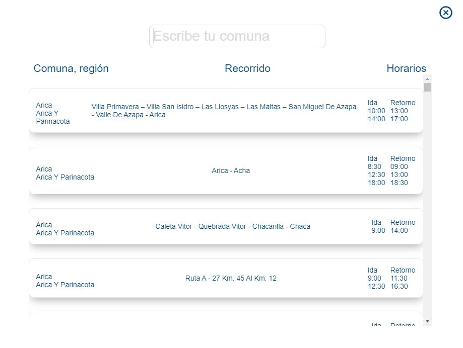 Posterior a ello, se debe presionar sobre el banner "Puedes buscar el servicio especial de transporte, aquí" y se desplegará el listado correspondiente.
