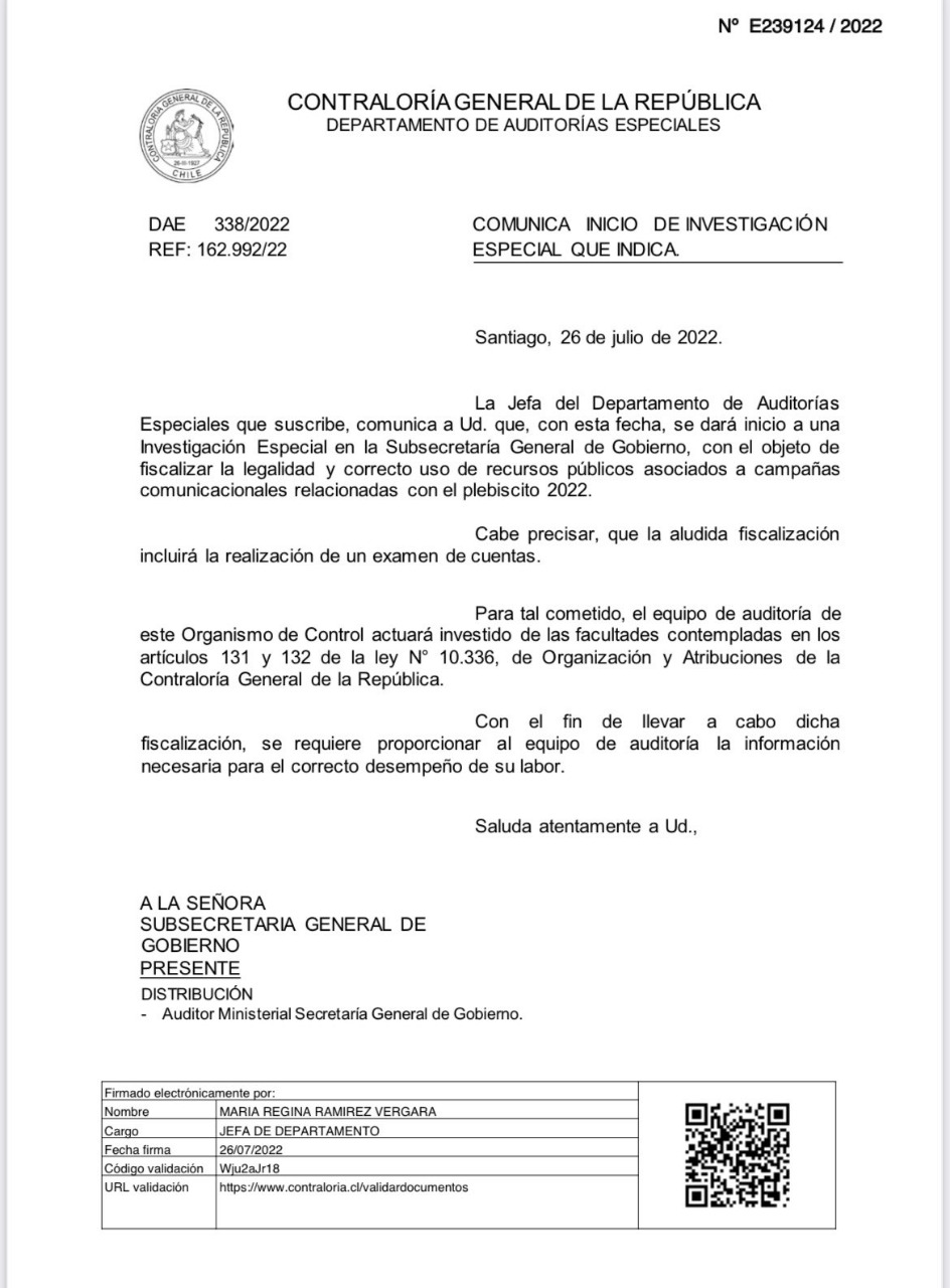 Luego de una acusación presentada por diputados republicanos, la institución emitió un oficio en el que se indicó que el objetivo será "fiscalizar la legalidad y correcto uso de recursos públicos asociados a campañas comunicacionales relacionadas con el plebiscito 2022".