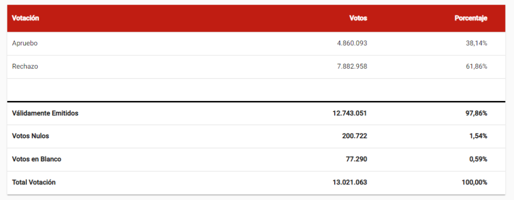 Finalmente, con un 99,95% de las mesas escrutadas, la opción Rechazo (61,86%) se impuso al Apruebo (38,14%) por amplia mayoría y superando los pronósticos de las encuestas. A pesar del resultado, voceros de la alternativa ganadora hicieron un llamado a realizar un nuevo proceso constituyente que "una" al país.