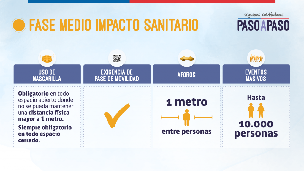 Hay que recordar que, en la actualidad, el Plan Seguimos Cuidándonos Paso a Paso contempla un aforo de hasta 10.000 personas en eventos masivos para aquellas comunas que se encuentran en etapa de Medio Impacto Sanitario.
