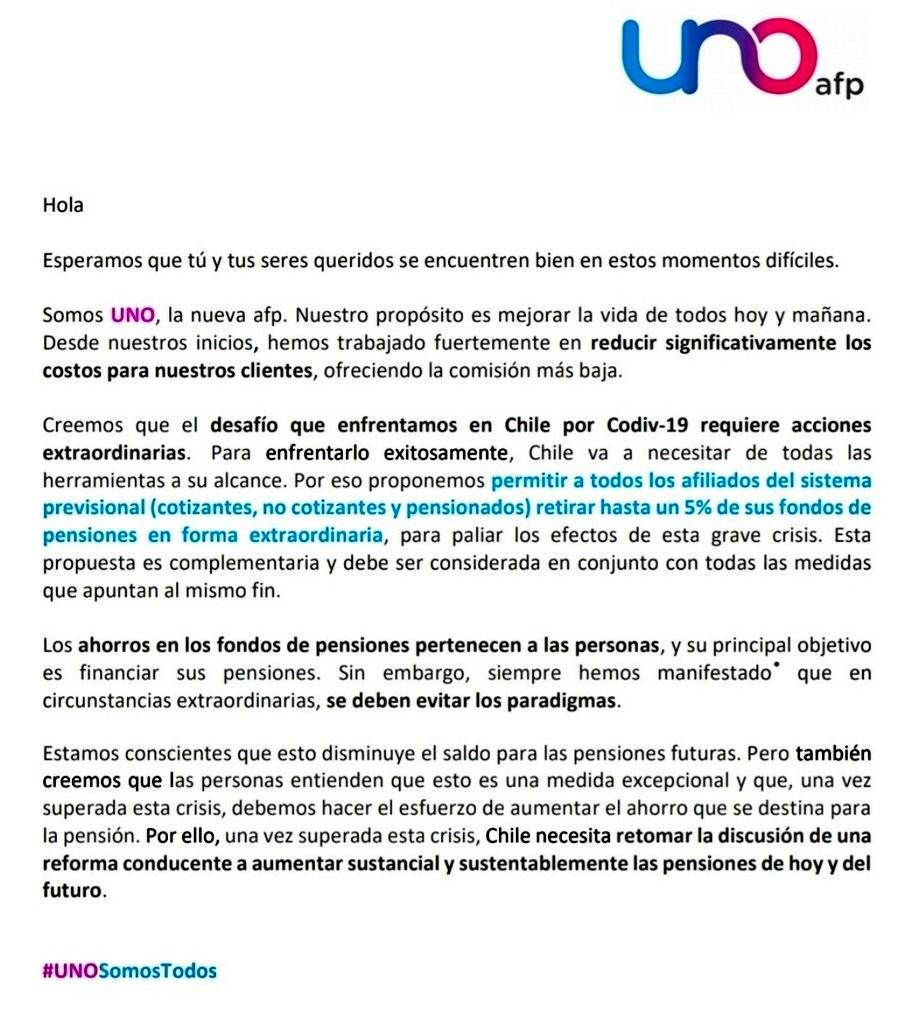 AFP Uno propuso este lunes a todos los afiliados del sistema previsional (cotizantes, no cotizantes y pensionados) que puedan retirar hasta el 5% de sus fondos de pensiones de forma extraordinaria en el contexto de la pandemia por coronavirus.