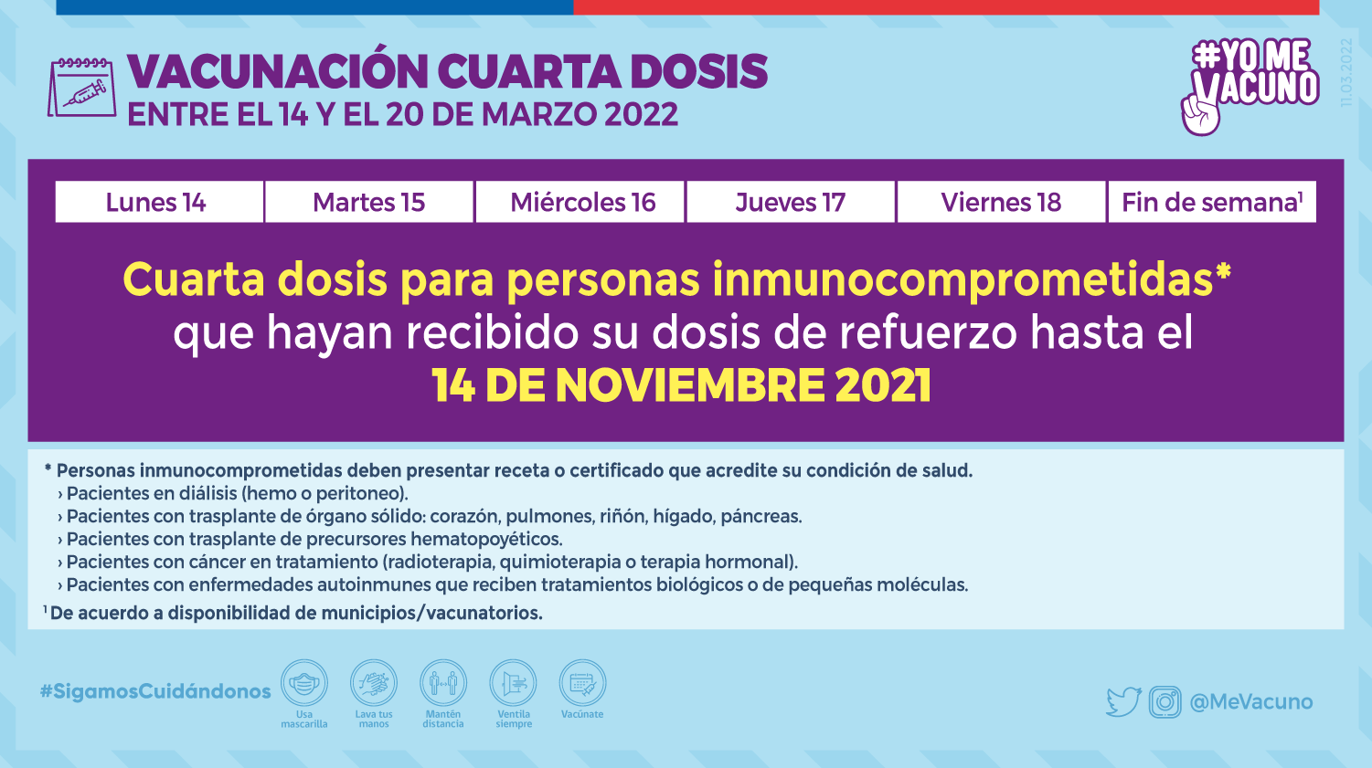 Lee también: Minsal flexibiliza tomas de PCR en Aeropuerto de Santiago: Serán aleatoriasSegún lo dado a conocer en el calendario oficial, a partir de este lunes podrán vacunarse con la cuarta dosis todos los mayores de 18 años que hayan recibido su anterior dosis de refuerzo hasta el 19 de septiembre pasado.