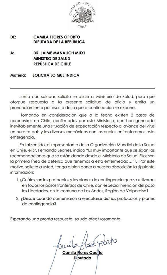 La parlamentaria confía en que sus propuestas y solicitudes serán escuchadas, tal como ocurrió cuando ofició al Ministro de Salud el pasado 4 de marzo para solicitar información respecto al protocolo que se estaba ejecutando en esa fecha en los pasos fronterizos.