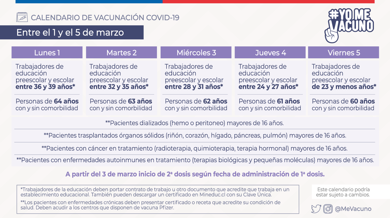 El proceso de inoculación continúa este martes 2 de marzo, cuando se inocule a trabajadores de educación preescolar y escolar entre 32 y 35 años, además de personas de 63 años con y sin comorbilidad.