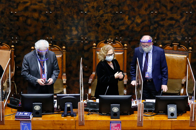 Debido a la pandemia, los parlamentarios y autoridades deben usar de forma obligatoria mascarillas y escudos faciales. Además, las mesas de cada senador cuentan con un separador de acrílico, con el objetivo de evitar contagios.