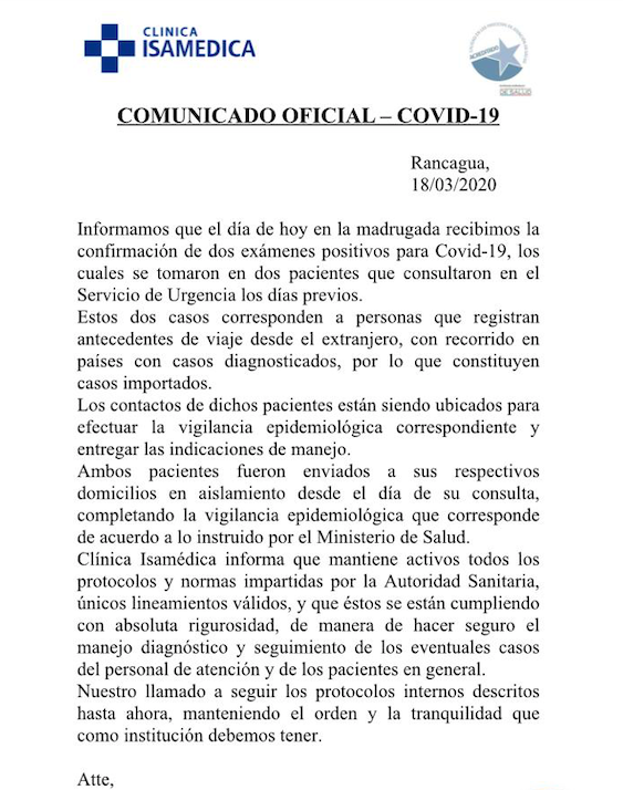 La Clínica Isamédica de Rancagua confirmó este miércoles la existencia de los dos primeros casos positivos por COVID-19 reportados en la capital de la Región de O'Higgins.