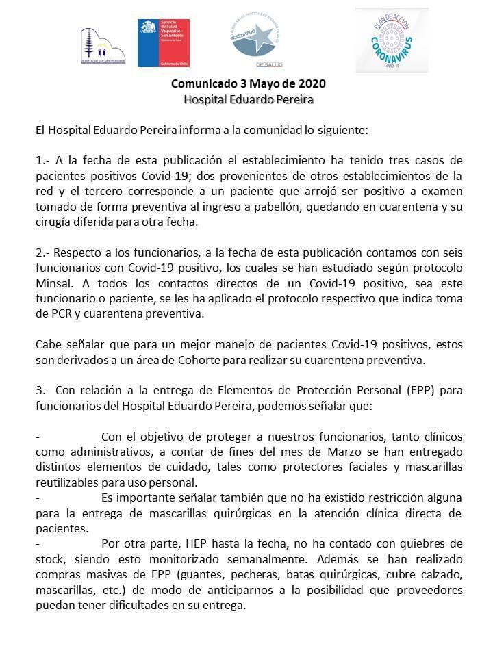A través de un comunicado publicado este domingo, desde el recinto hospitalario indicaron que "a la fecha de esta publicación contamos con seis funcionarios con COVID-19, los cuales se han estudiado según protocolo Minsal"