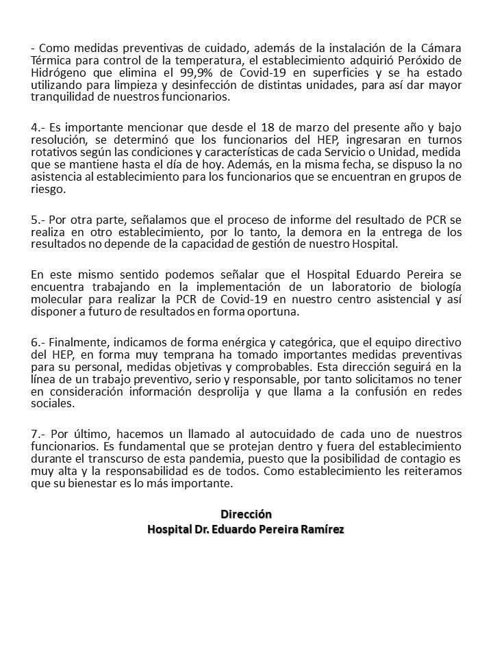"Indicamos de forma enérgica y categórica que el equipo directivo del HEP, en forma muy temprana, ha tomado medidas preventivas para su personal, medidas objetivas y comprobables", continúa el texto.