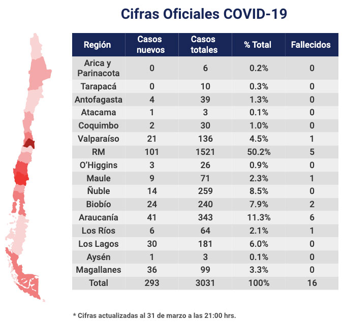 El ministro de Salud, Jaime Mañalich, anunció este miércoles que entre las 24 horas transcurridas entre las 21 horas del martes y la misma hora del miércoles en el país se registraron 293 casos nuevos de COVID-19, lo que suma un total de 3.031 contagiados.
