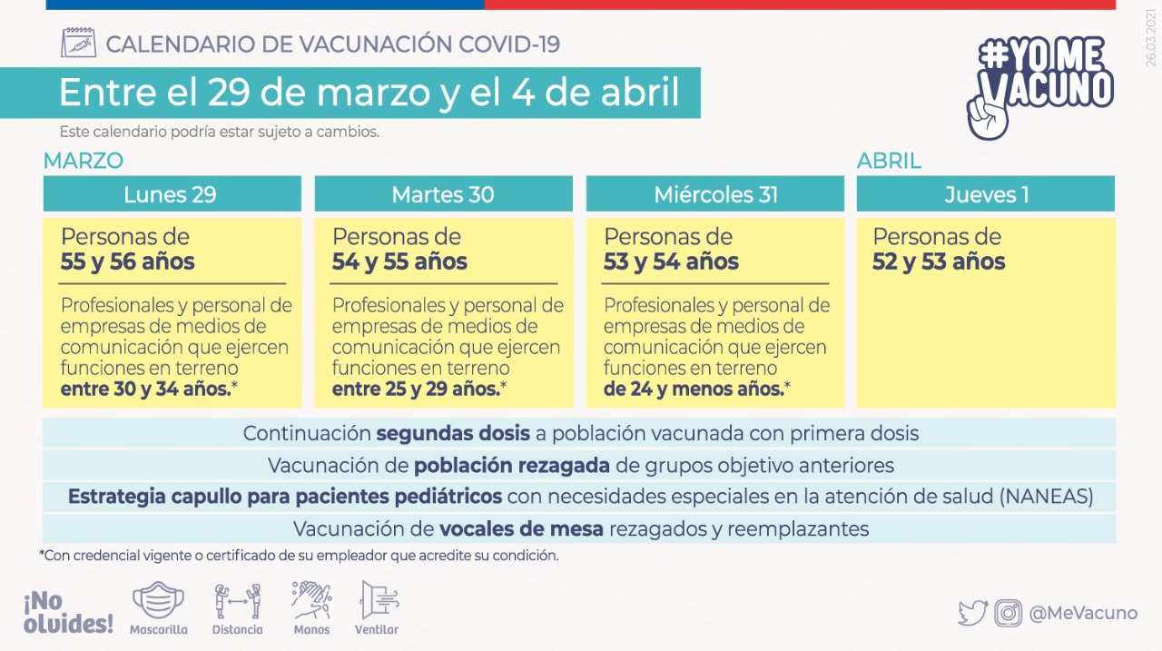 Lee también: Plan Paso a Paso: La fase en que estará cada comuna del país desde el lunes 29 de marzoEn tanto, el Minsal reveló cómo sigue el calendario de vacunación para la última semana de marzo, cuando se continúe con la inoculación de personas sanas y personal de medios de comunicación.