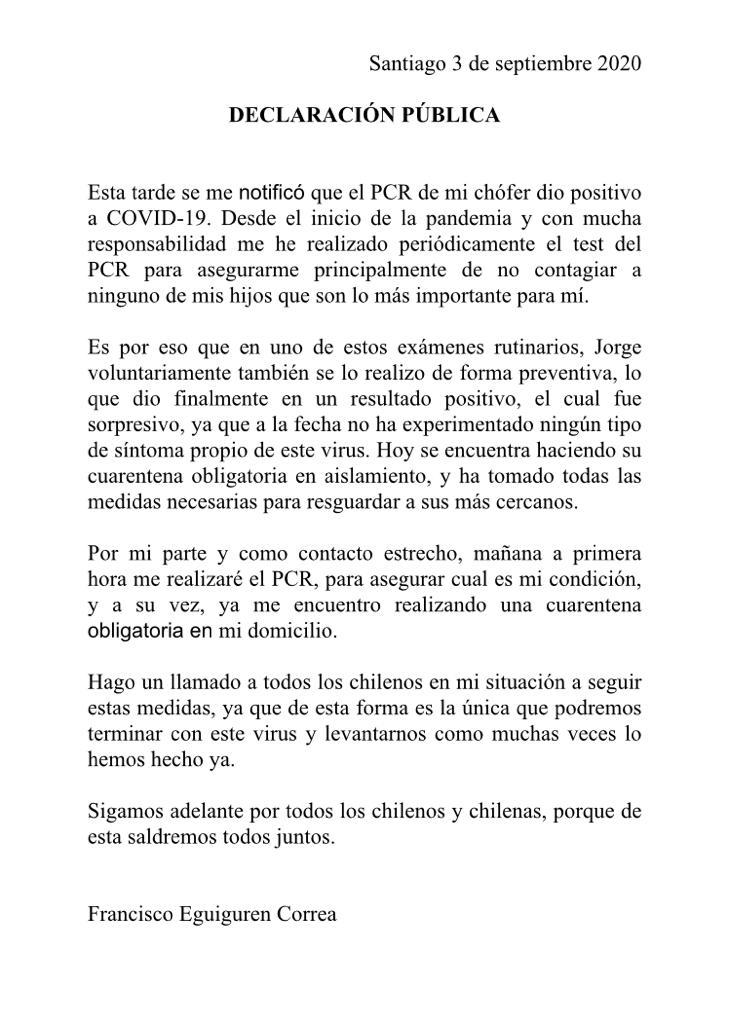 Lee también: Daza reconoce riesgo en reuniones durante Fiestas Patrias, pero llama a "confiar en las personas"Por su parte, Eguiguren aseguró que se encuentra en confinamiento obligatorio en su domicilio y que este viernes se someterá a un test PCR, ya que fue un contacto estrecho.