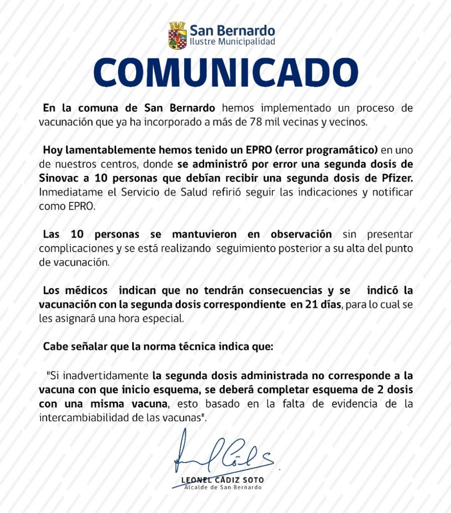 La municipalidad de San Bernardo informó de un error en el proceso de vacunación en la comuna que afectó a 10 personas, quienes fueron inoculadas con dos tecnologías diferentes.