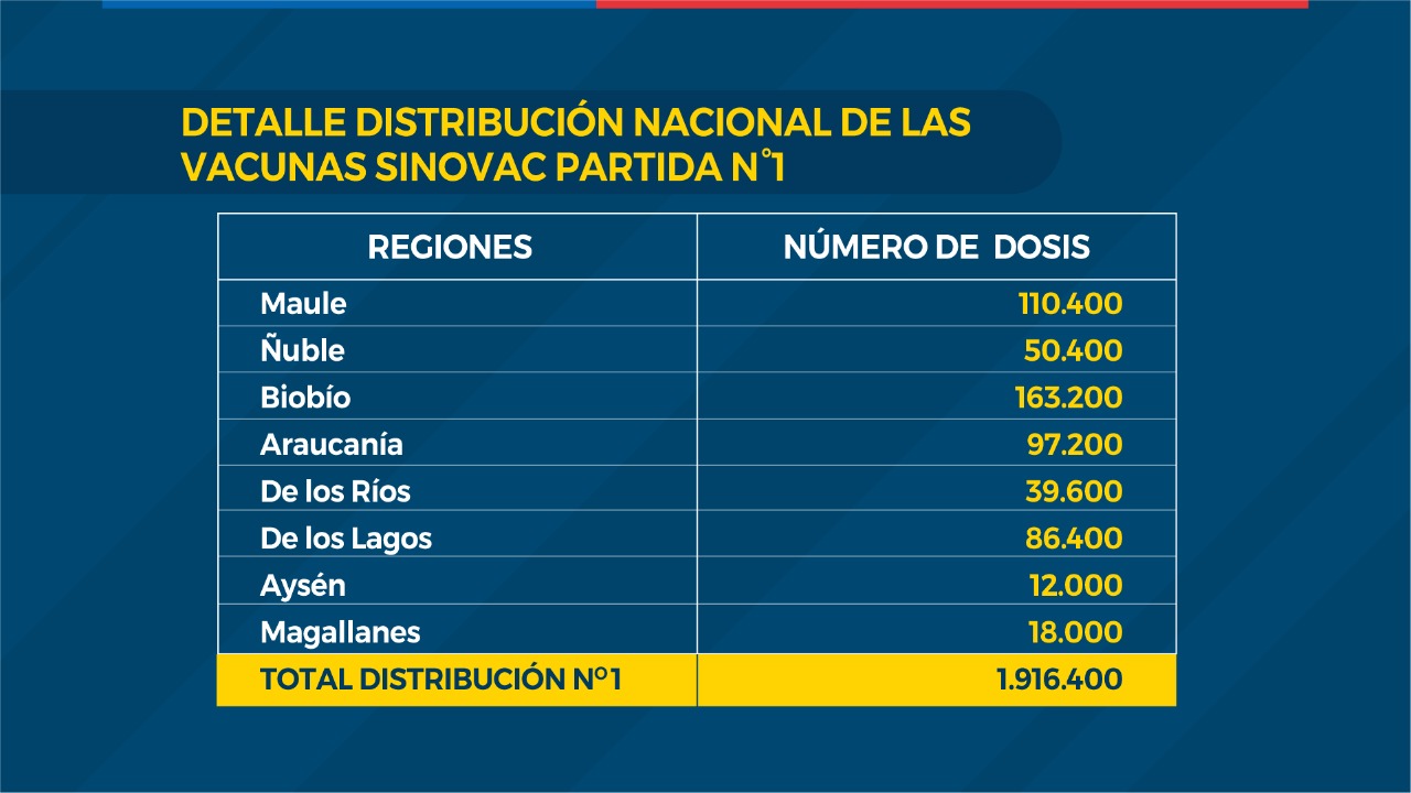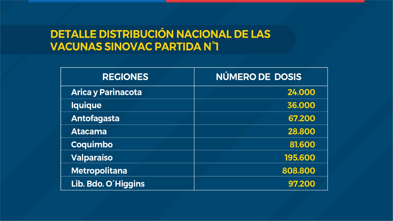 La mayor cantidad de dosis de Coronavac irán para las regiones Metropolitana (808.800), Valparaíso (195.600), Biobío (163.200) y Maule (110.400).