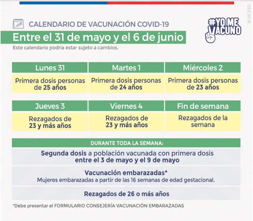 En forma paralela, durante la primera semana de junio serán inoculadas embarazadas a partir de las 16 semanas de gestación, quienes reciben segundas dosis y rezagados de 26 años o más.