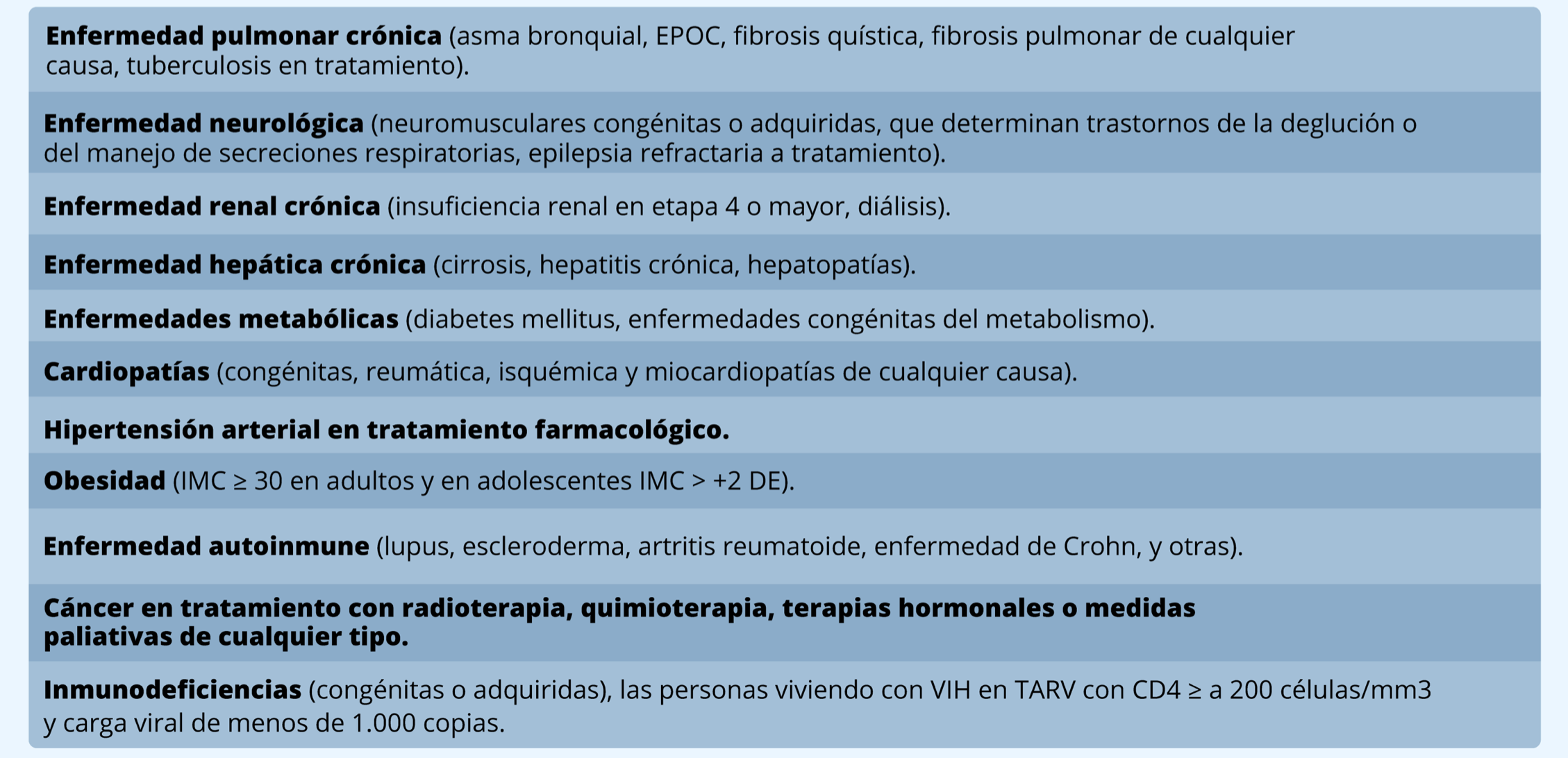 Las comorbilidades o enfermedades crónicas consideradas para la inoculación de la población fueron detalladas en el sitio web del Minsal. Allí indicaron que se encuentran enfermedades pulmonares crónicas, enfermedades neurológicas, renal crónica, hepática crónica, metabólicas, cardiopatías, entre otras.