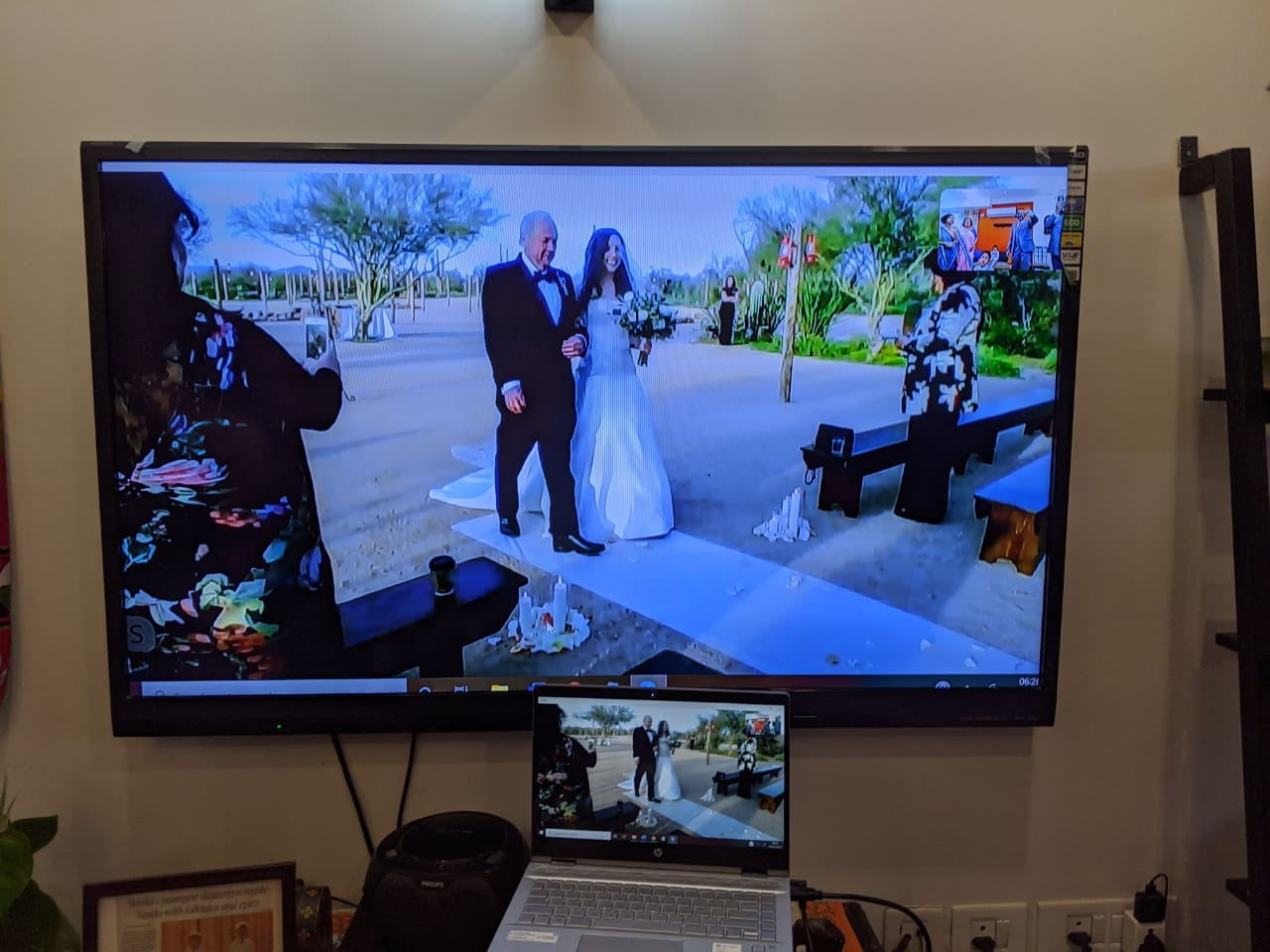 Cuando estuvieron listos para que comenzara el servicio, entraron a la sala de estar y se unieron a otros miembros de la familia para ver una transmisión de video bidireccional mientras su hijo se casaba en Phoenix, Estados Unidos, a casi 13 mil kilómetros de distancia.