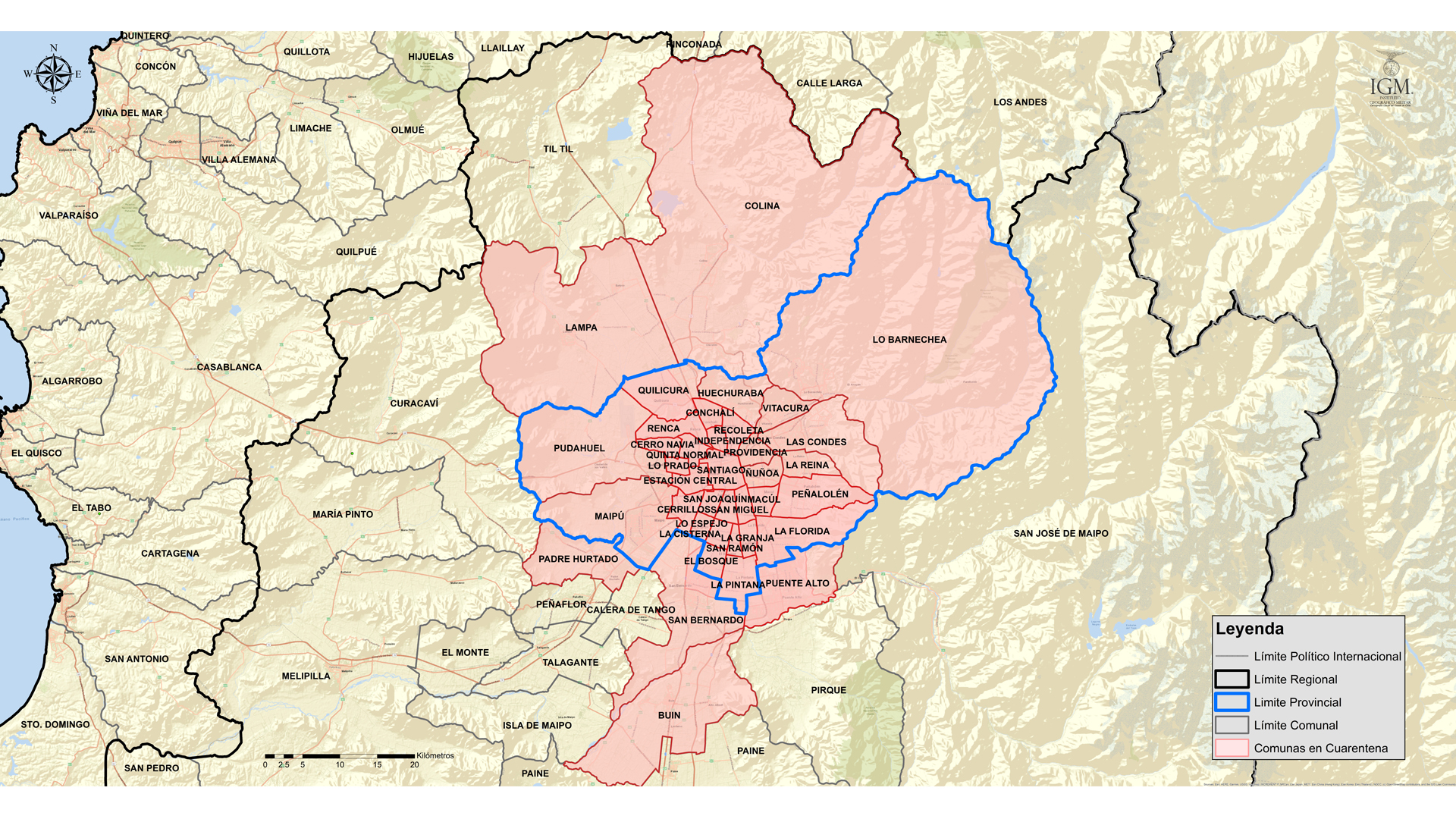 En el caso de la Región Metropolitana, la autoridad anunció una cuarentena total para todo el Gran Santiago, que corresponde a las 32 comunas que pertenecen a la provincia de Santiago, a las que se suman San Bernardo, Buin, Puente Alto, Lampa, Colina y Padre Hurtado.