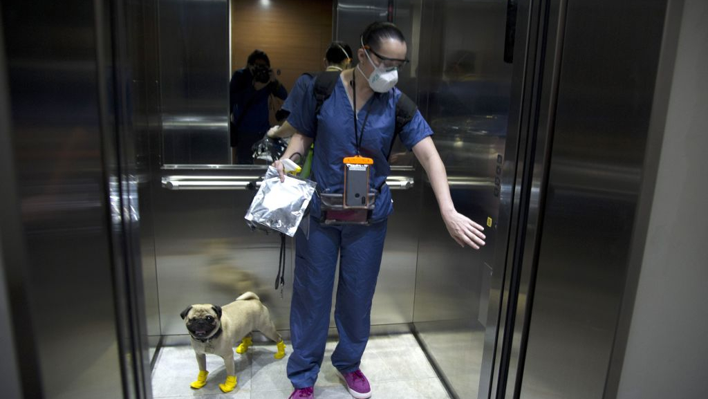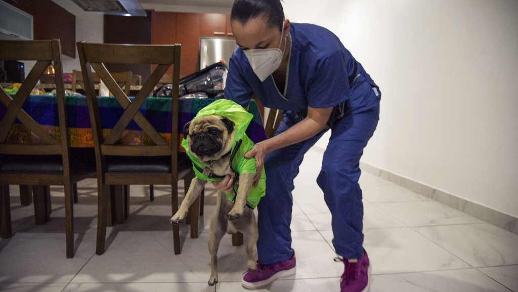 Debidamente protegido con botas amarillas, gafas y un traje protector, Harley el “Tuerto” -apodo dado porque perdió uno de sus ojitos cuando era cachorro- comienza cada día de trabajo, siendo apoyo para el personal sanitario que atiende a pacientes con COVID-19 en la capital mexicana.