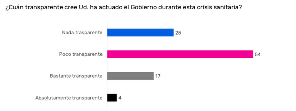 En la misma línea, los encuestados fueron consultados sobre el manejo del Ejecutivo durante la crisis sanitaria, un 54% se inclinó por la opción "poco transparente" y un 25% por “nada de transparente”.