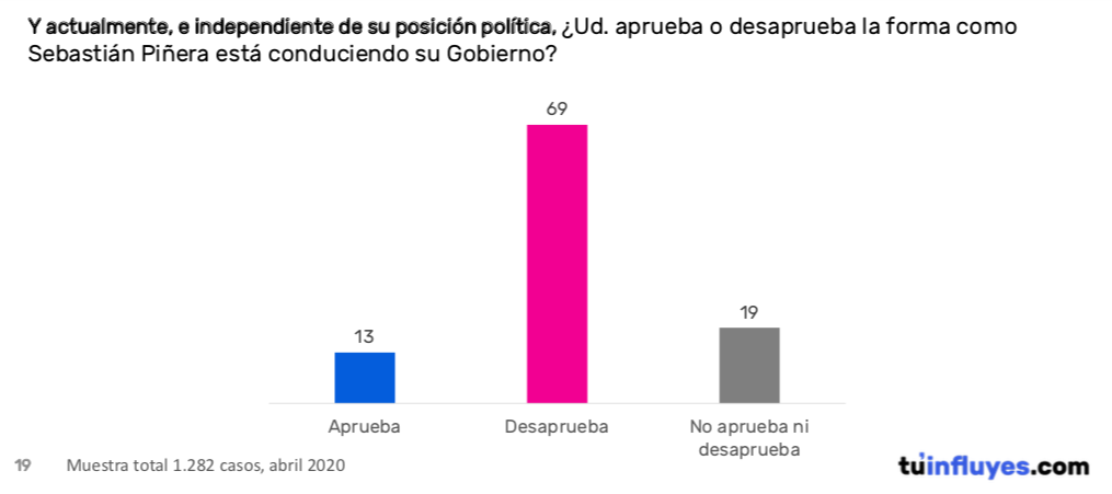 La aprobación del presidente Sebastián Piñera alcanzó el 13% mientras que un 41% cree que las medidas anunciadas por su gobierno para enfrentar la crisis están dirigidas a la “grandes empresas”.