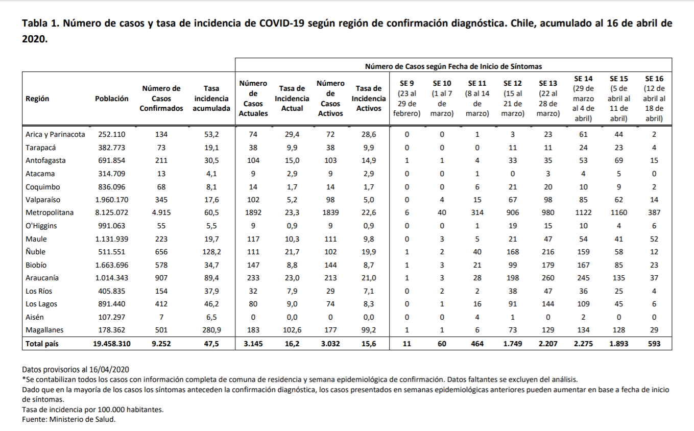 Este sábado, el Ministerio de Salud publicó la corrección del noveno informe epidemiológico sobre la propagación del coronavirus, el cual entrega un análisis descriptivo de los casos notificados en todo el país hasta las 21:00 horas del 16 de abril.