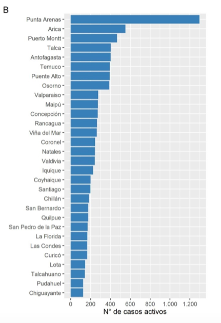 En el ranking de casos activos por comunas, lidera el top 10 Punta Arenas, con 1.298, cifra de contagios que representa más que el doble de la comuna que le sigue: Arica, con 552 casos activos.