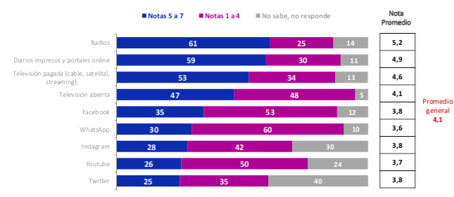 En cuanto al nivel de confianza en las fuentes de información, la mejor nota se la lleva la radio con 5,2, luego los diarios impresos y portales online con 4,9, la televisión pagada con 4,6 y la televisión abierta con 4,1. Las redes sociales son las peores evaluadas .