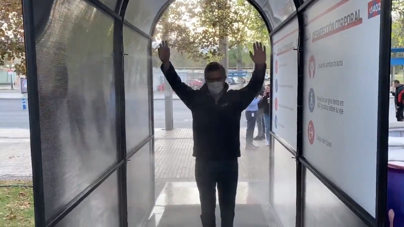 El túnel sanitizador fue implementado en Las Condes el jueves 2 de abril. "Tiene un estanque que lanza un líquido que se llama ácido hipocloroso, que es un desinfectante de objetos. Lo que más desinfecta es la ropa, las mochilas, los zapatos", añadió el alcalde.