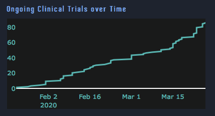 En la misma página se puede observar un gráfico con las pruebas clínicas realizadas a lo largo del tiempo. Desde febrero a esta parte, la cantidad de intentos ha aumentado exponencialmente.