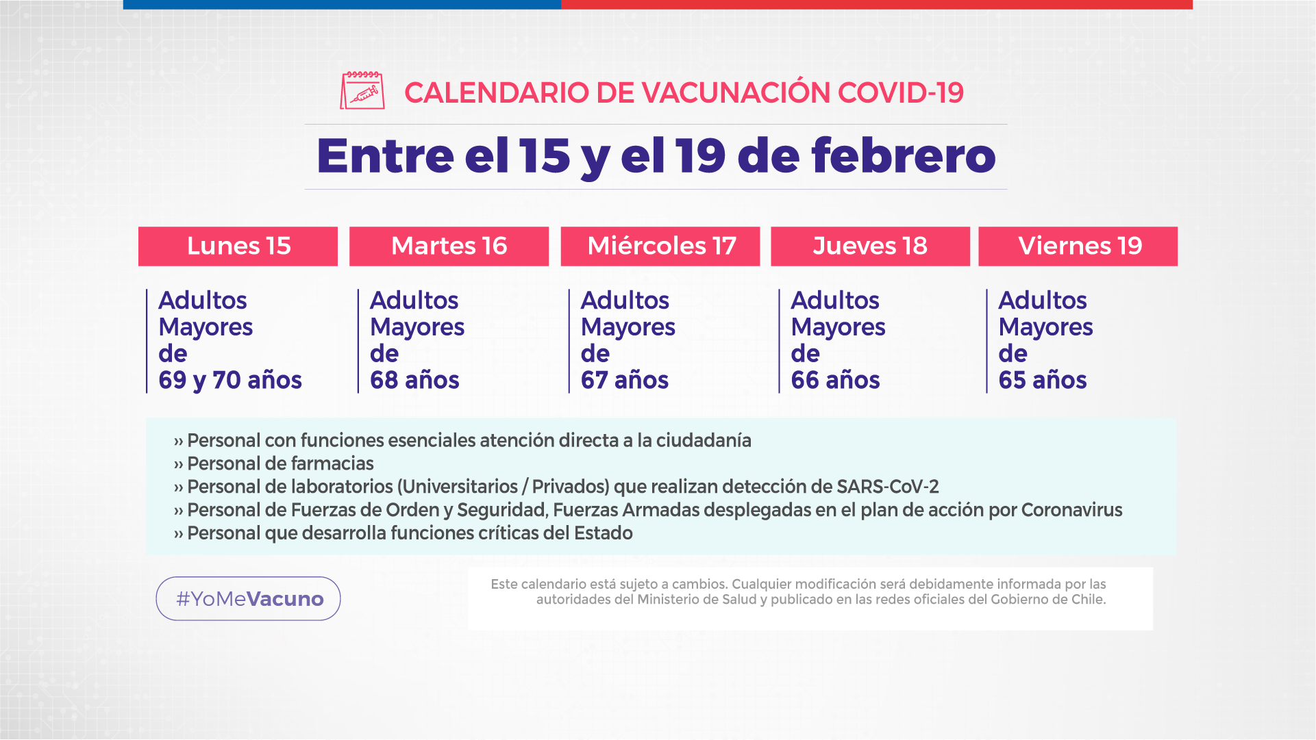 De esta manera, cada día un grupo diferente tendrá acceso al proceso que continuará progresivamente hasta el viernes 19 de febrero, cuando se inoculen los adultos mayores de 65 años y a los profesores y trabajadores de la educación mayores de 60 años.