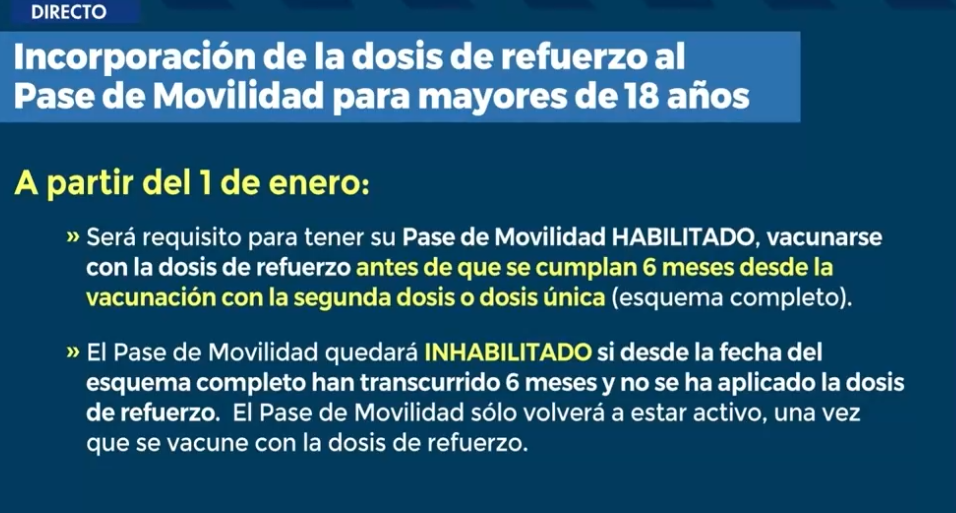 Según lo detallado por la subsecretaria Valenzuela, desde esa fecha todos los mayores de 18 deberán estar vacunados con la dosis de refuerzo para poder habilitar el Pase de Movilidad. De lo contrario, será inhabilitado.
