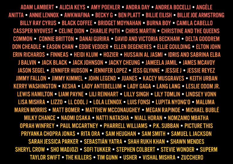 Curado en colaboración con Lady Gaga, el especial incluirá las actuaciones o presentaciones de Alicia Keys, Amy Poehler, Andrea Bocelli, Billie Eilish, Billie Joe Armstrong de Green Day, Burna Boy, Camila Cabello, Celine Dion, David y Victoria Beckham, Eddie Vedder, Ellen DeGeneres, Elton John, J Balvin, Jennifer Lopez, John Legend, Maluma y muchos más.
