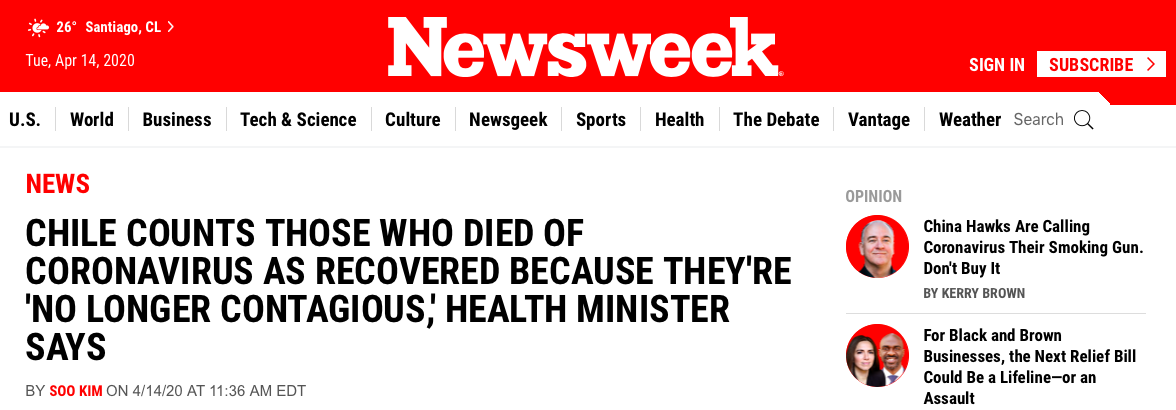 Chile contabiliza a los muertos como recuperados “porque ya no pueden contagiar”. Así tituló el medio español La Vanguardia una noticia sobre los dichos del ministro de Salud, Jaime Mañalich, quien el 7 de abril dio a entender que la cifra de pacientes recuperados incluía a los fallecidos.