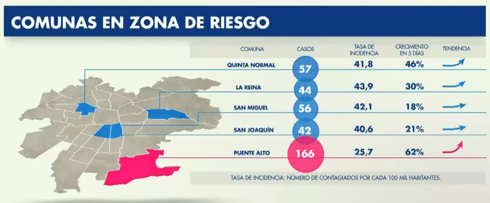 Lee también: Turismo vs cuarentena: Cómo sobrevivir a una crisis que trasciende a empresas y pymesPuente Alto, por ejemplo, tiene 166 casos confirmados, lo que en sí misma es una cifra peligrosa, pero con una tasa muy por debajo de otras comunas. En el caso de esta comuna lo que gatilló también en que se decretara cuarentena fue el abrupto crecimiento del número de contagios.