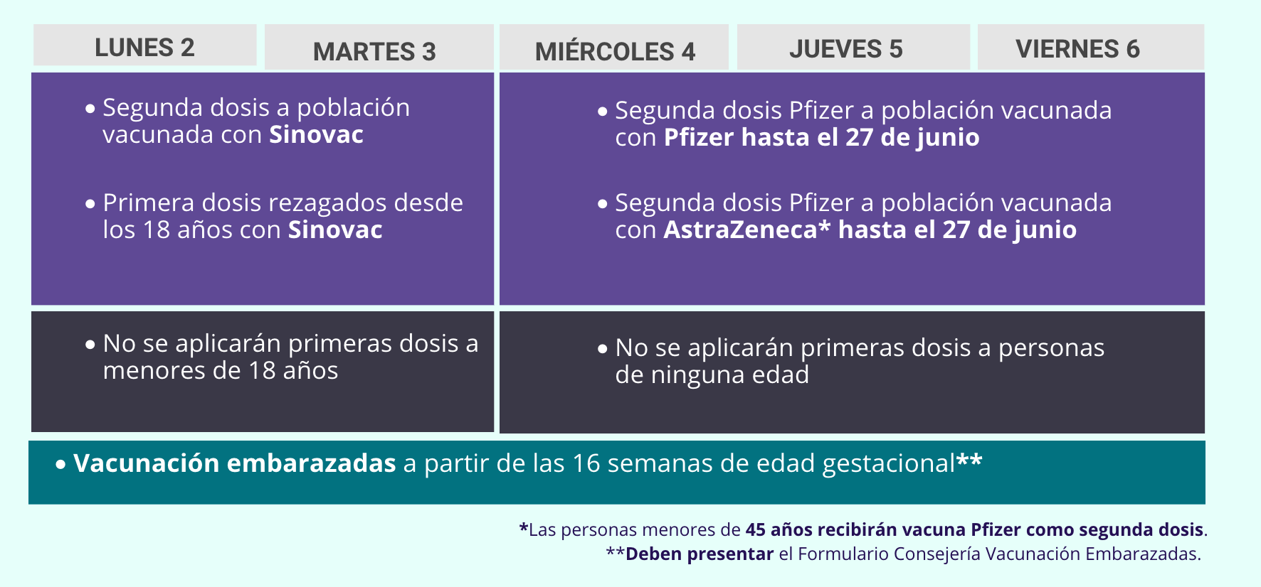 - Lunes 2 de agosto: Segunda dosis a población vacunada con Sinovac; primera dosis rezagados desde los 18 años con Sinovac; vacunación de embarazadas. No se aplicarán primeras dosis a menores de 18 años.
