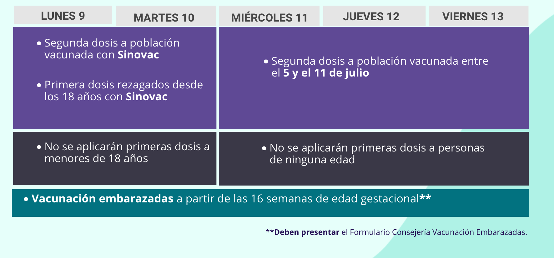 - Lunes 9 de agosto: Segunda dosis a población vacunada con Sinovac; primera dosis rezagados desde los 18 años con Sinovac; embarazadas. No se aplicarán primeras dosis a menores de 18 años.