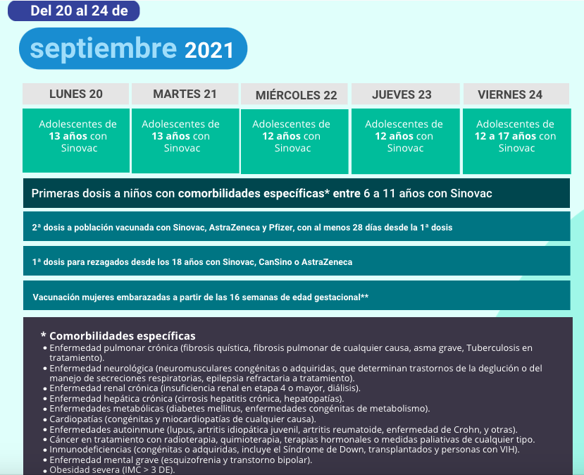 De acuerdo al calendario oficial del Ministerio de Salud (Minsal), también se pueden inocular las embarazadas, niños con comorbilidades específicas, personas inmunocomprometidas y algunos rezagados.